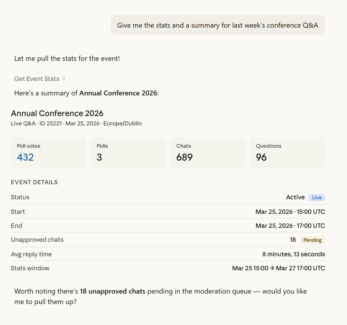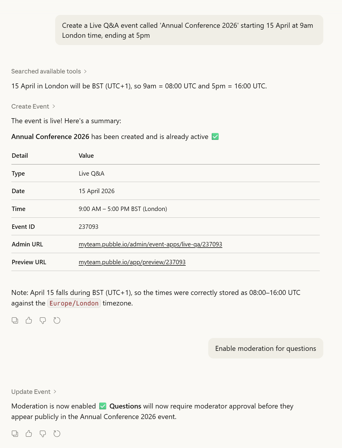 Ask your assistant: "Create a Live Q&A event called 'Annual Conference 2026' starting 15 April at 9am London time, ending at 5pm"