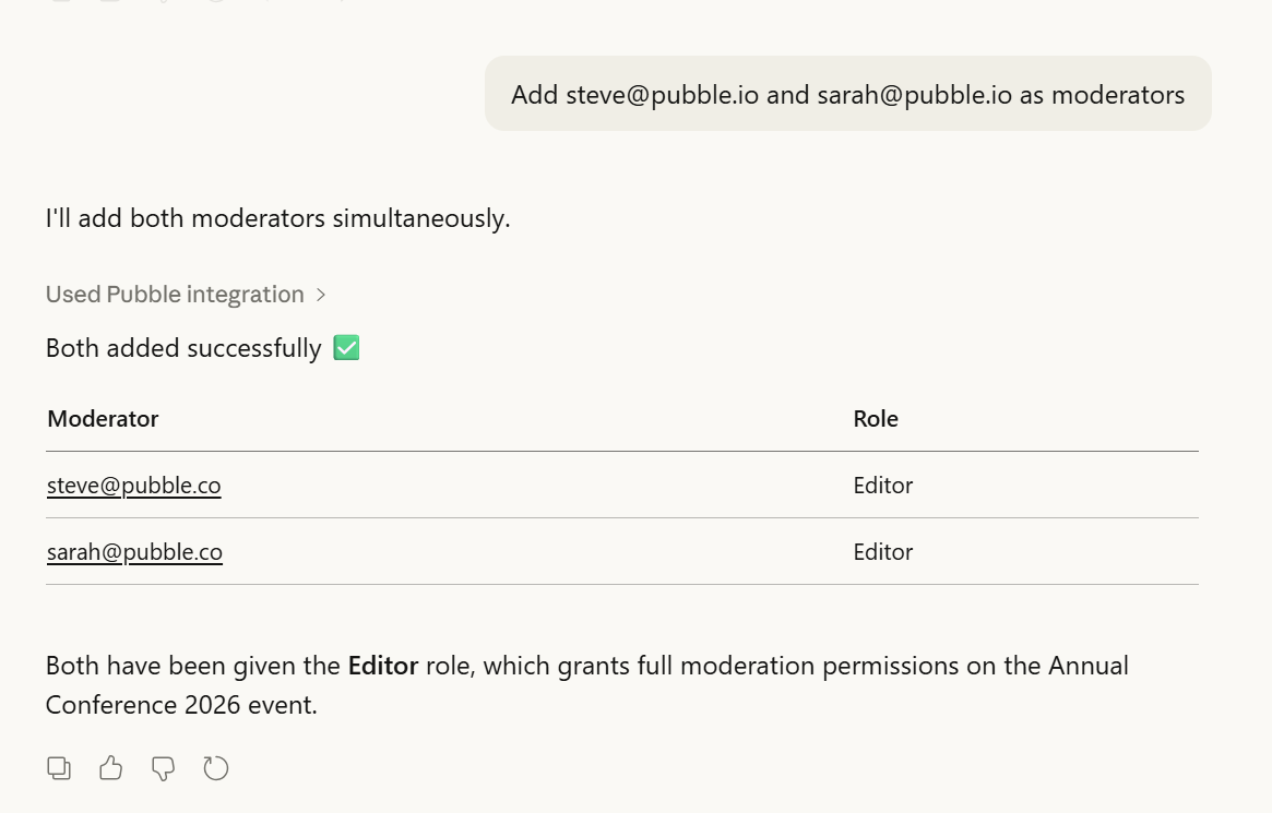 Ask your assistant: "Add steve@pubble.io and sarah@pubble.io as moderators"