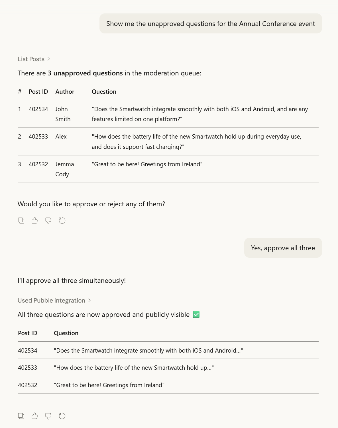 Ask your assistant: "Show me the unapproved questions for the Annual Conference event"