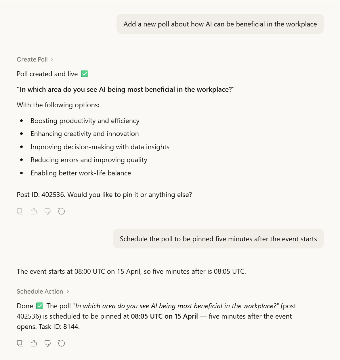 Ask your assistant: "Add a new poll about how AI can be beneficial in the workplace"